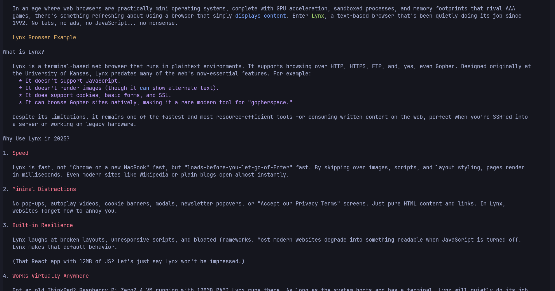 Despite its limitations, it remains one of the fastest and most resource-efficient tools for consuming written content on the web, perfect when you’re SSH’ed into a server or working on legacy hardware.